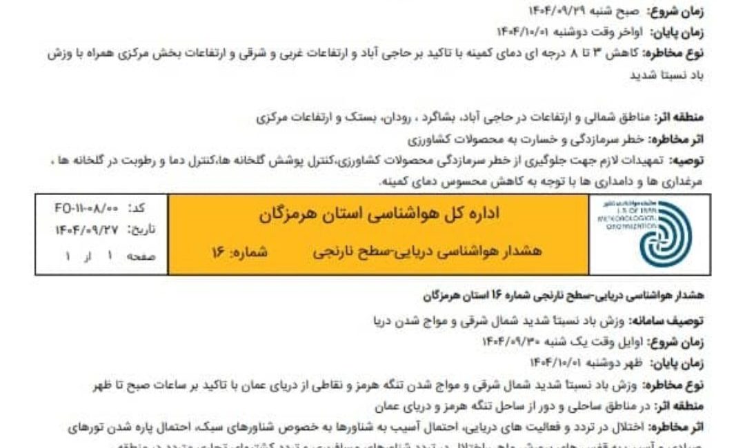 ادامه مطلبهشدار نارنجی هواشناسی در هرمزگان؛ خطر سرمازدگی محصولات کشاورزی و طوفانی شدن دریا